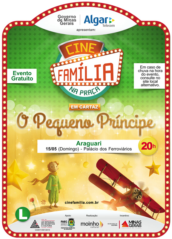 Filme “O Pequeno Príncipe (2015)”, ainda inédito nas TVs abertas e por assinatura, é destaque da terceira edição do Cine Família na Praça, evento gratuito e livre para todos os públicos que será realizado em Araguari, no dia 15 de maio próximo. A apresentação acontecerá às 20h, na Praça Gaioso Neves, em frente ao Palácio dos Ferroviários. O Cine Família na Praça, que conta pela terceira vez com patrocínio da Algar Telecom por meio da Lei Estadual de incentivo à Cultura de Minas Gerais, visa proporcionar ao público uma experiência de cinema a céu aberto, levando todos os equipamentos de uma verdadeira exibição cinematográfica para praças públicas.