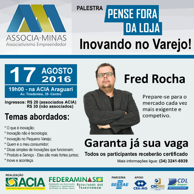 Motivar empreendedores, lojistas, gestores de negócios e atendentes do comércio local. Esse é objetivo da Associação Comercial e Industrial de Araguari (ACIA), em parceria com a Federaminas e o Sebrae, ao trazer à cidade, nesta quarta-feira (17), o publicitário Fred Rocha (foto) para uma palestra com o tema “Pense Fora da Loja. Inovando no Varejo!”.