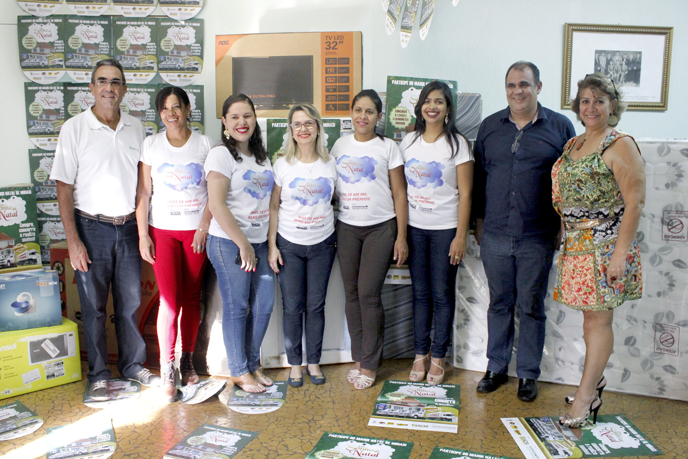 | Equipe de colaboradores da ACIA, ladeada pelo presidente Carlos Antônio Vieira e pela gerente da entidade, Adélia de Mendonça Naves, coordenadora da campanha. |