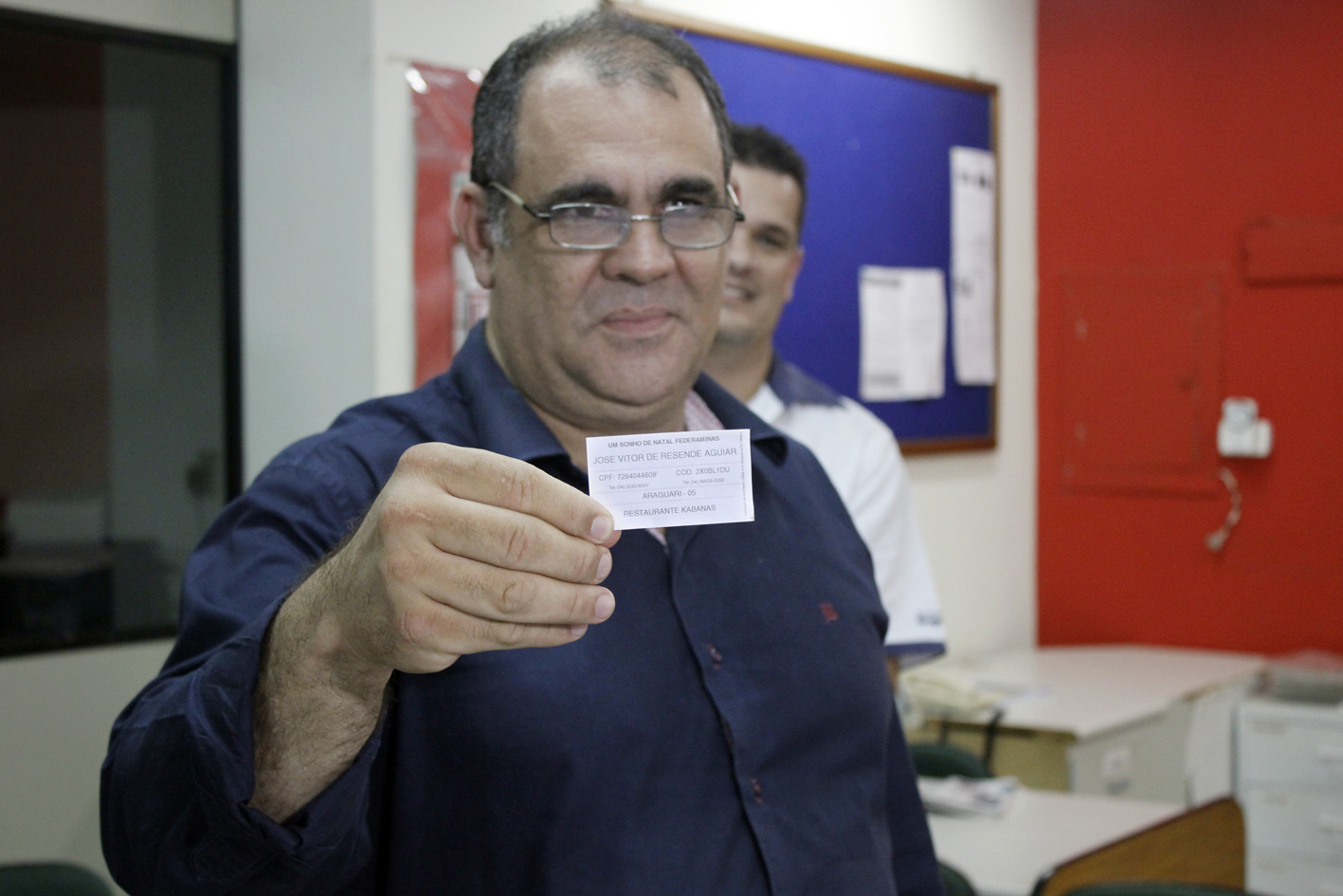| O ganhador do prêmio, José Vitor de Aguiar, e o presidente da ACIA, Carlos Antônio Vieira, mostram o cupom premiado que fez parte do lote de "seladinhas" do Restaurante Kabannas |